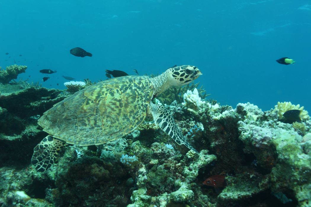 Hawksbill turtle sighting before she left into a sea fan filled passage.