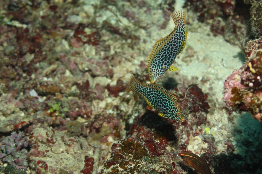 A bunch of red-margined fairy wrasses in the rubble areas around Namena (that is a new find for us.)