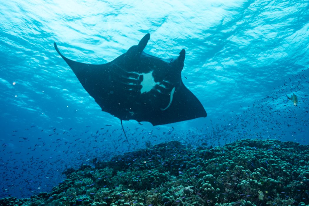 “Pregnant shark, big shark, baby sharks.” - Lynn (Schoolhouse) with three melanistic mantas rays soaring by them.