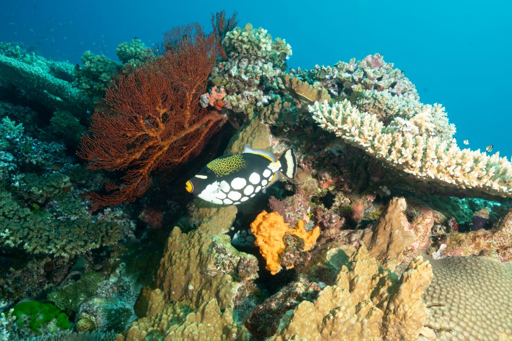 Sea fans, hardcoral, leather coral and a picasso triggerfish ~ Janet