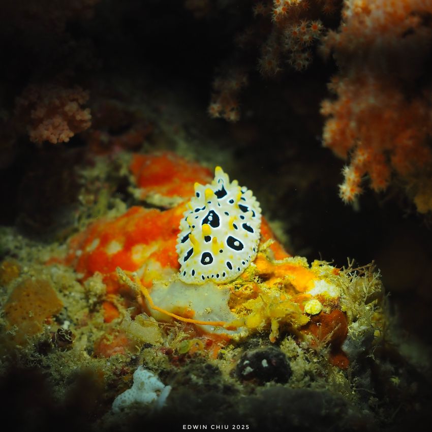 Absolutely gorgeous wart sea slug hiding in a completely covered yellow soft coral cave ~ Edwin
