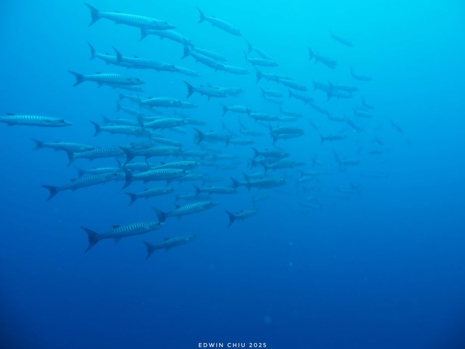 Among the big eyed trevally grey reef sharks and pick handle barracudas looming on top of us.
