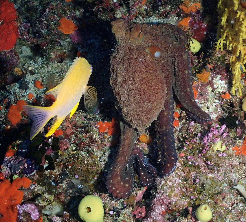 Common octopus who spent 10 minutes teasing us up and down, changing his colors and making Sheila shriek in delight ~ Jay