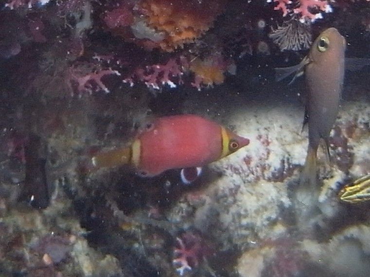 Nai’a pipefish found while chasing a little sharpnose; brown banded pipefish found while we were inundated by fish, both groups, at Maytag, all going mad! Red snappers, unicorn fish, all types of fusiliers, tuna and Spanish mackerel.