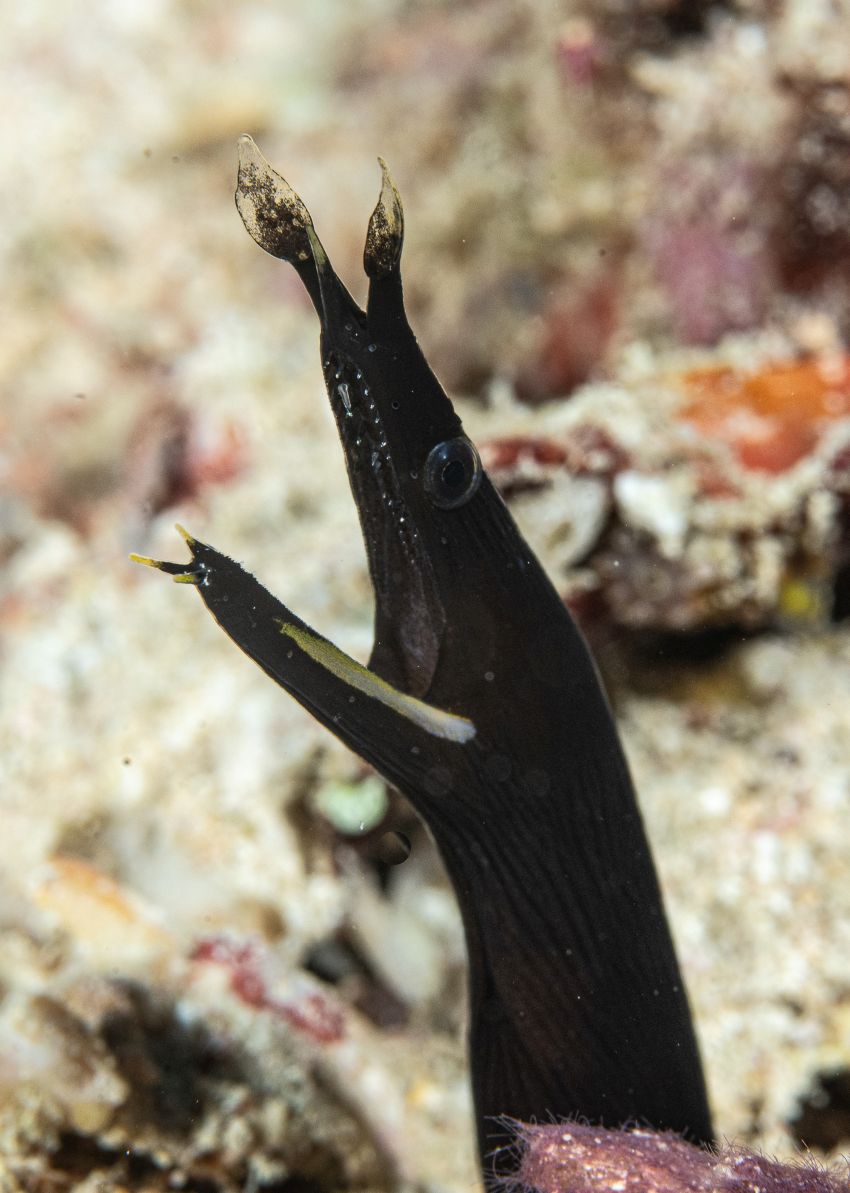 Massive huge moray eel with a lot of its body out of his crevice, and next to him, the elusive NAI’A pipefish!