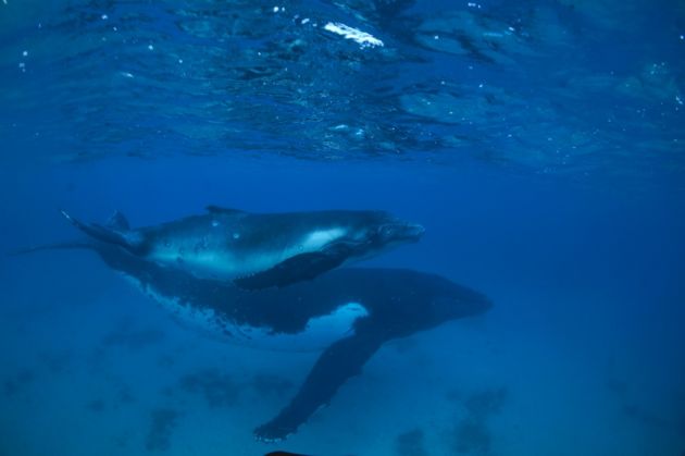 Things heated up again on the fifth day as we witnessed fly-bys by five whales at a time. The afternoon brought us a dramatic heat run involving six whales. Because they are so focused on battle, we were able to follow so closely by boat to watch them lunge and ram each other right under the bow. One individual repeatedly made a move that may become a new trend among Tonga’s humpbacks. He swept his pectoral fins backwards allowing him to lift the front half of his body out of the water before thrusting forward. After several hours of conflict, one whale seemed to signal submission (or was it a female protecting herself?), by lying belly-up and slapping both mighty pectoral fins. Divers on Ladd Reef that afternoon saw mating oscillated phyllidia and oodles of shrimp during the night dive.