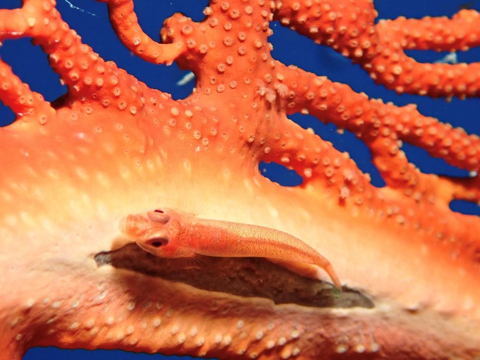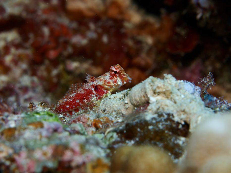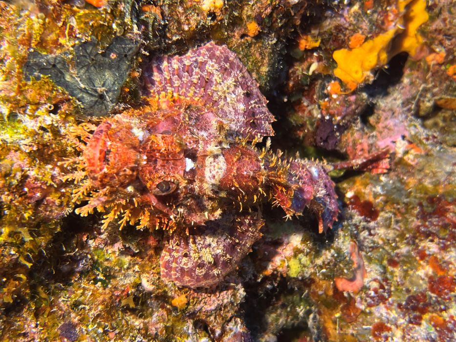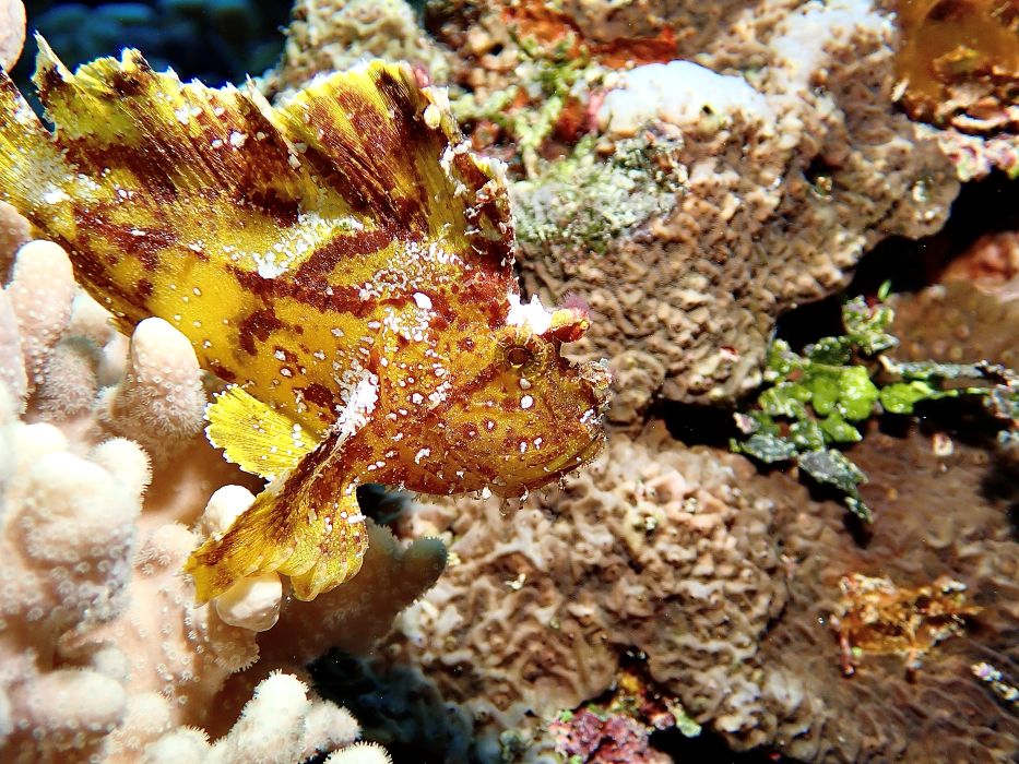 Baby raggy scorpionfish on sea fan, letting himself fall to hide from us: SO adorable.