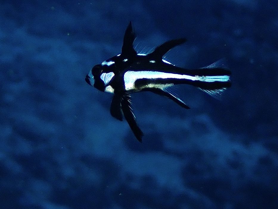 Juvenile solar box fish alongside squirrelfish, soldierfish, cardinal fish, and juvenile regal butterflyfish: all fluttering in and out of the darkness.