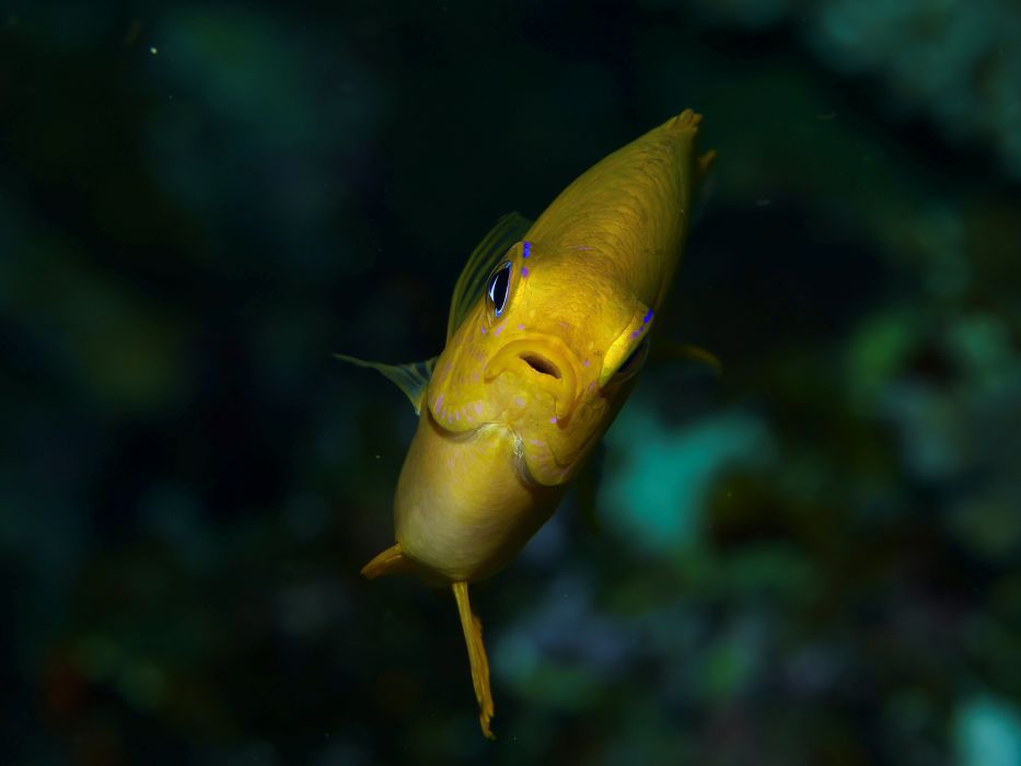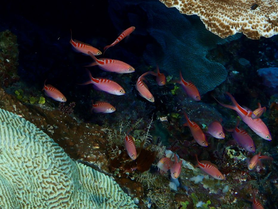 Some major different anthias in the area that divers realized: purple queen anthias look dark blue with no light on it; hawkanthias have almost the same face tattoo as Mike Tyson; and square spotted anthias in the deep, alongside blue headed tilefish.