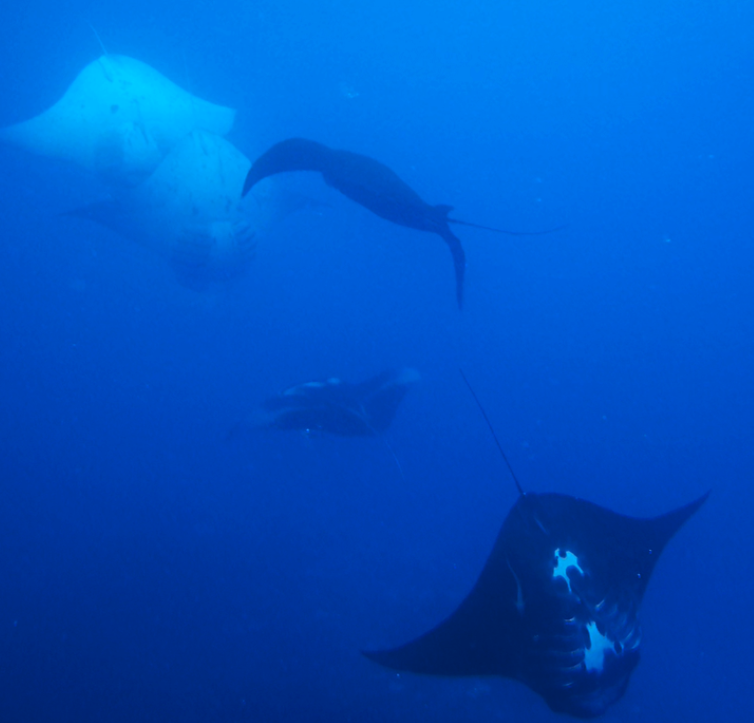 Dropped in, received by 3 mantas, joined by 2 more and even an extra 2 more; seven mantas barrel rolling for food for a good 20 minutes of our dive.