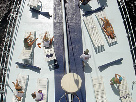 Carl Waxman (on rare wakeful moments) and his brother Gary led 16 friends, medical colleagues, family members, and miscellaneous Waxman groupies on their first NAI’A adventure. Along for the ride were Bethany and Steve Merrett, ring-ins that quickly became part of the family as the group gelled into a lean, mean, kava-swilling, diving machine. The weather started and ended in fine Fiji style while the in-between bits tested the resolve of our hardcore divers. Among the hardest of the hard was Blair Andrew with his trusty pointer and magnifying glass at the ready for anything the NAI'A guides could spot. Also right up there in the keen diver category were Jim and Edrianna Stilwell, along with brother-in-law Stan Bysshe and their collective arsenal of housings and strobes at the ready… and always in the right place when the odd eagle ray or other shootable subject would appear. The old-skool photgraphers were well represented with the Waxman boys having mixed success – Gary unintentionally enjoying life as an unencumbered diver – and Steve Kletz tackling the tricky NikV 15mm for the first time. Ray and Holly Atcherson, along with Stilwells, managed to keep the group in touch with the 21st century and produced some incredible images with their trusty little digital rigs. Ed “the mountain man” Carter was the undisputed “I’ve-got-more-stuff-hanging-off-my-rig-than-anybody” champion of the trip. Kevin Callahan was in danger of losing wife Lisa to the Fijian school of dance at Somosomo village, but managed to get her back on board in time to celebrate her birthday. Kim Radvan and Zina Novak had to be closely watched while packing to ensure our dear chef Peni wasn’t going to be smuggled away for their own culinary desires. And, Peggy and Sarah Bellows kept the NAI'A guides on their toes, and even ensured Mo had his weekly session of bubble blowing.