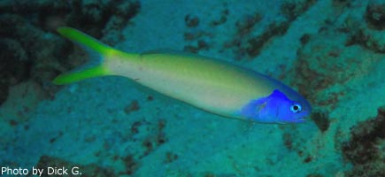 We also found a not so shy sharpnose wrasse in a crevice and even managed to show it to Leanne B. before it disappeared. The definite highlight of this time's Teton I dive must be the dense blanket of deep blue lunar fusiliers, which covered the pinnacle completely from top to bottom, during the whole first dive. We also had a very cooperative porcelain crab in an anemone, sitting out in the open for the photographers. Teton II's leaf fish was there, as well as a small, very friendly hawksbill turtle, yellow-faced gobies living with red-lined shrimps on the sandy bottom, and two golden mantis shrimps.